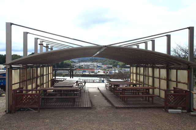 デッキテラスと「田園資料館」の間には屋根付きの休憩所もあります。田園資料館内休憩所も併せて、日差しの強いときや雨の日に便利ですね。