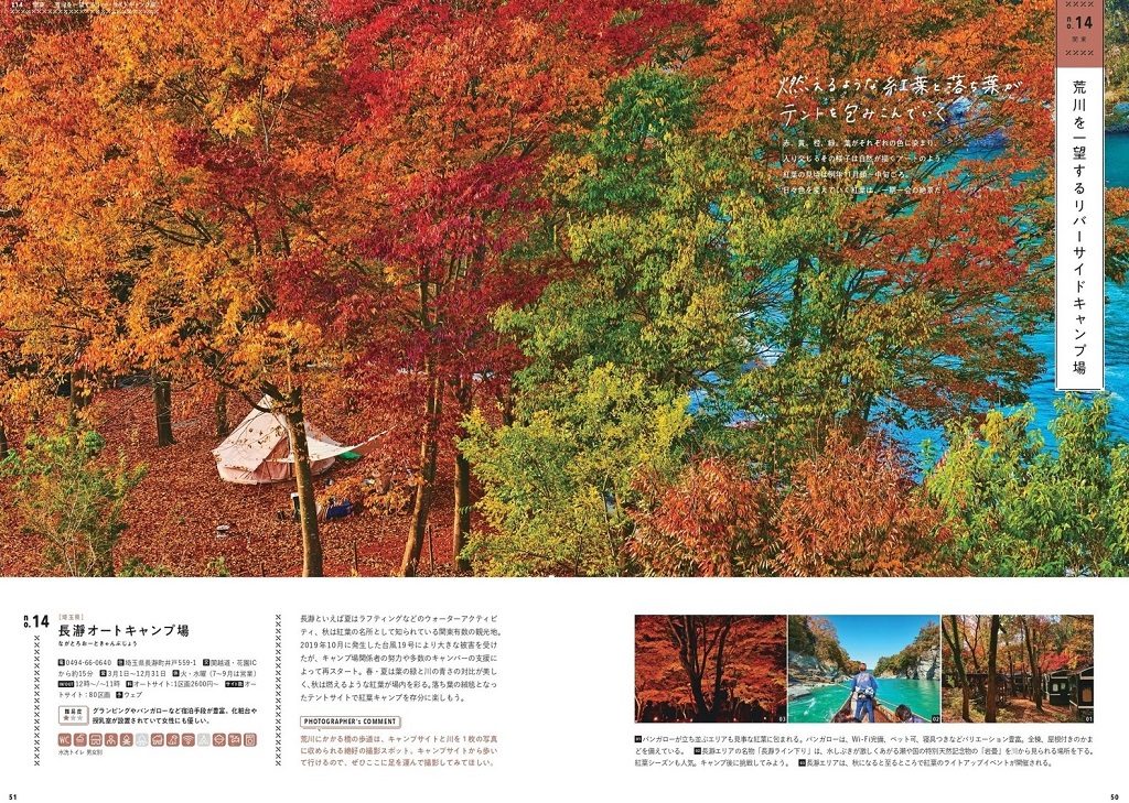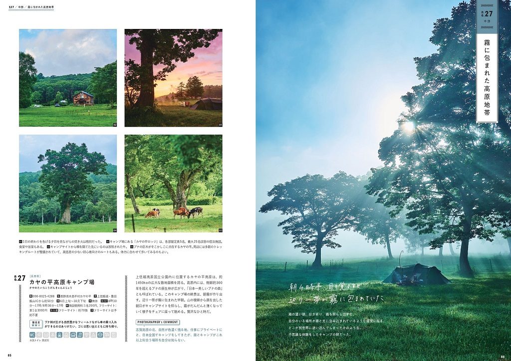 すべての写真は撮りおろし。年間約100日キャンプをするフォトグラファー・猪俣慎吾氏が撮影をしています。実際にキャンプ場を訪れ、絶景を堪能した猪俣氏ならではの、リアルなコメントも掲載しています。