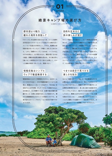 「絶景キャンプ場の選び方」「星を見るにはどうすればいい?」「絶景を見るための移動手段と装備」「無人島でキャンプをする方法」など、絶景キャンプを堪能するための“コツ”がコラムで紹介されています。キャンプのレベルをアップするハウツー情報が満載です。