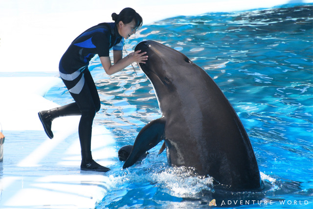 マリンライブ「Smiles」では、イルカ、クジラたちがスピーディーでダイナミックなパフォーマンスをトレーナーさんたちと一緒に披露してくれます。素敵な音楽と共に繰り広げられるパフォーマンスは、海の生きものとヒトが一体となったミュージカルを見ているかのような感動すら覚えます。ここでパフォーマンスを披露してくれる生き物は4種類、バンドウイルカ、カマイルカ、ハナゴンドウ、オキゴンドウ、そしてトレーナーさんたちです。20分の夢のような時間が過ぎたころには、子どもたちの将来の夢が“イルカのトレーナーさん”になっているかも。
