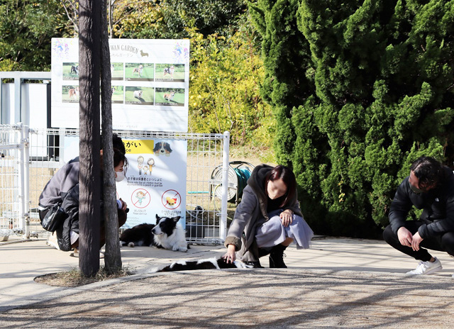 「わんわんガーデン」では、アニマルアクションにも出演しているイヌたちと遊ぶことができます。優しく撫でてあげると、ゴロンと横になるイヌも。雨の日は、エンジョイドーム2階でふれあうことができます。