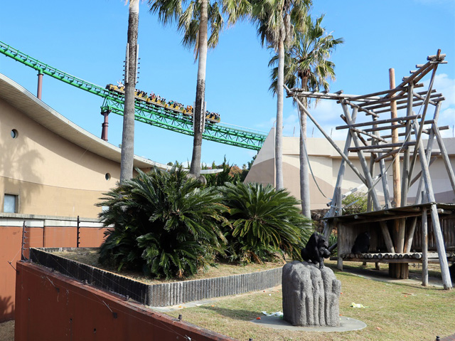 チンパンジーの後ろ遠くを走行するビッグアドベンチャーコースター
