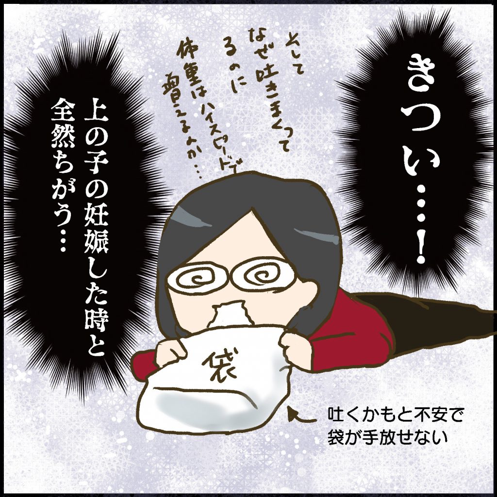 上の子よりもきつかったです。もどしているのに体重増加は激しく、さらにお腹が出るスピードも早い! 赤ちゃんはまだ●グラムほどしかないのに、なんで〜!?