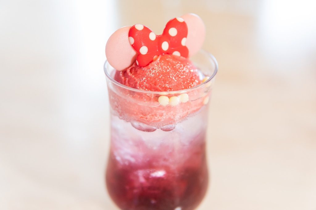 こちらはチョコレートで出来たミニーマウスのリボンが可愛いミックスベリーソーダフロート♪ボリュームもあって大満足です。よく見ると苺のシャーベット部分には銀箔がキラキラ…。
