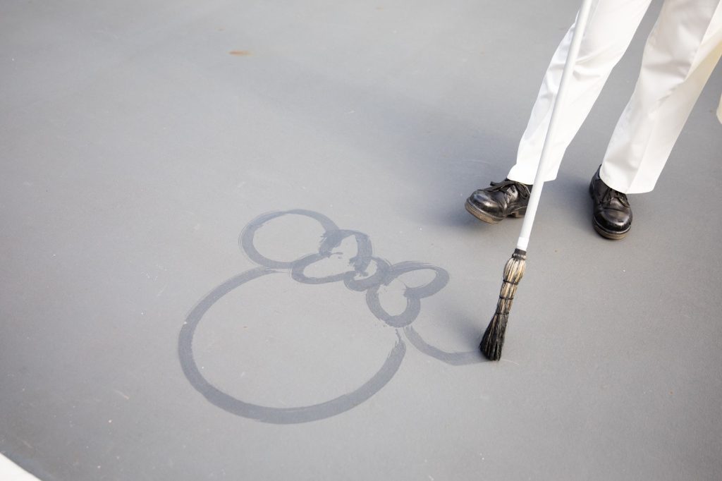 さて、トータリー・ミニーマウスのパレードまであと15分になりました。パレードルートで待機していると、何やら人だかりが。どうやら、カストーディアルキャストが地面に絵を描いているみたいです。