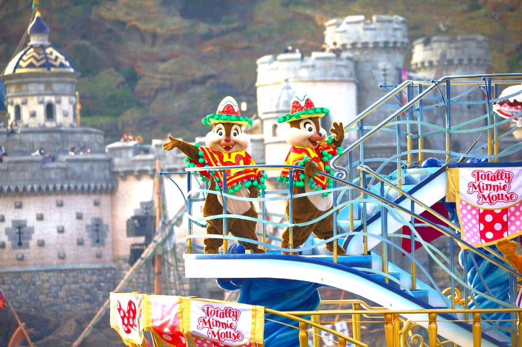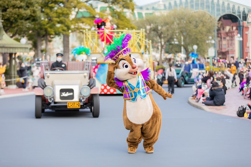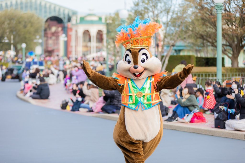 軽快な音楽と共にパレードがスタート!先頭をきるのはチップとデール。歩いてゲストの前を通り抜けます。