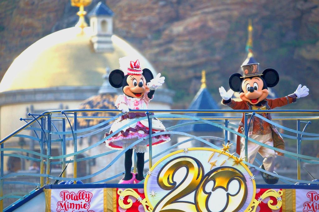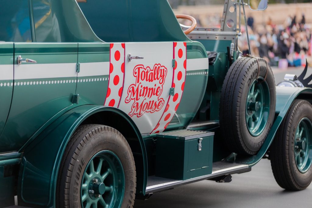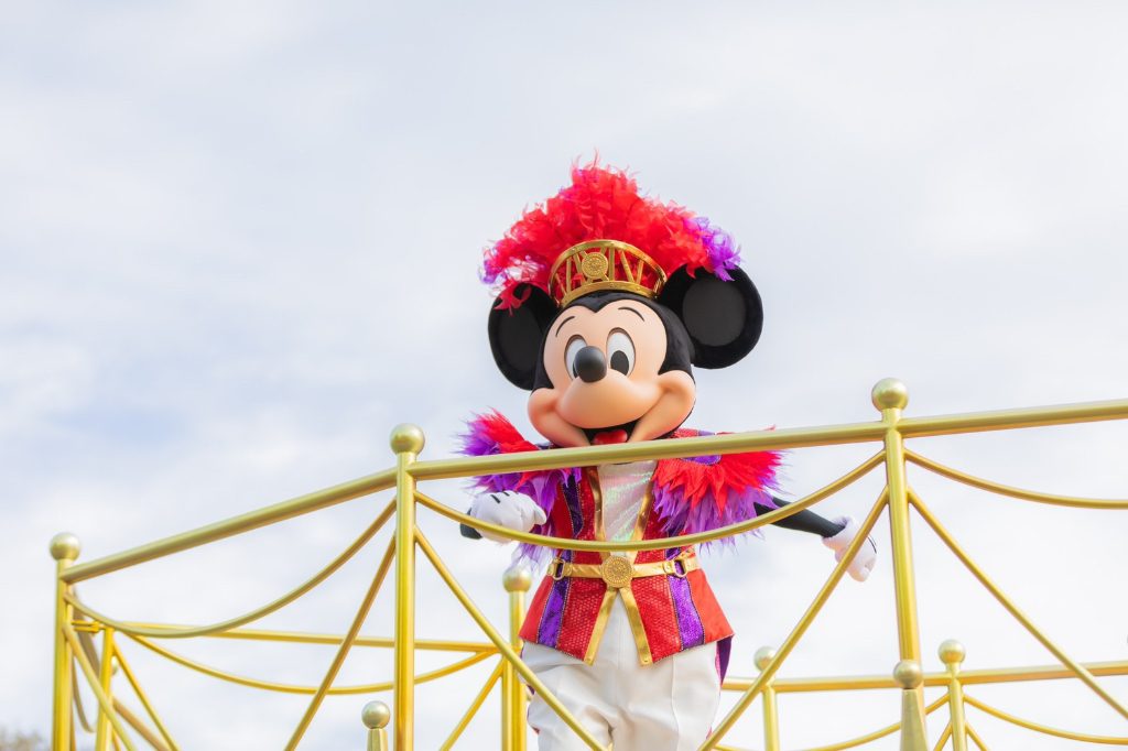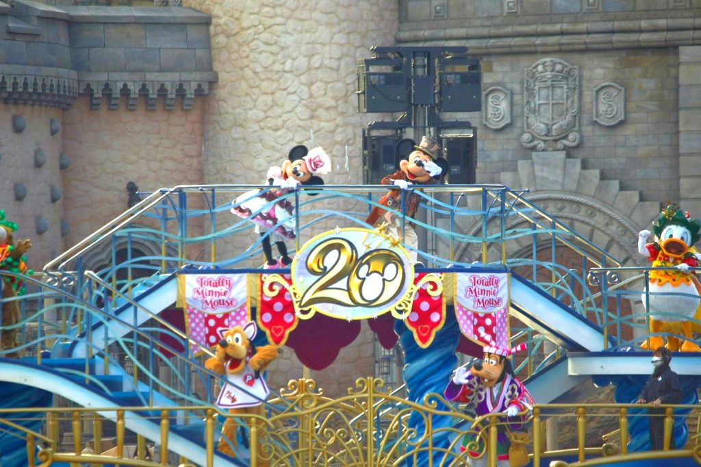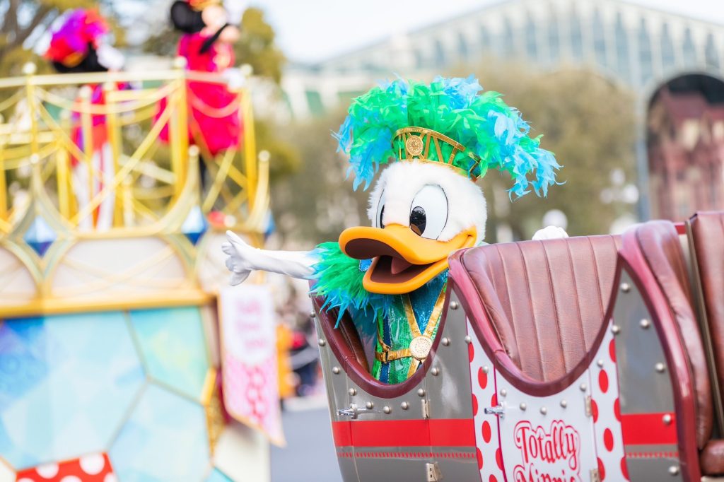 フロートに乗っているのはミニーマウスとミッキーマウス! 高い位置にいるので、前列じゃなくてもしっかり見えます。キャラクター達はこれまでに開催された様々なショーのコスチュームを着用しています。今日はミニーが主役なので、ミッキーにカメラを向けると「あっちを見て!」と言わんばかりのジェスチャーでした。
