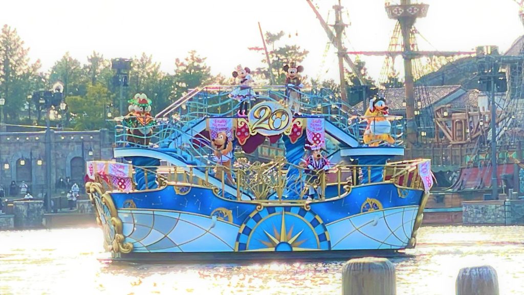 穏やかな天気のなか、始まるまで待機します。ミニーマウス達が乗る船はハーバーを一周してくれるので、正面じゃなくてもちゃんと観られますよ。