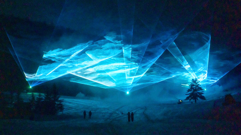 日が沈んだあともお楽しみがあります。夜空を幻想的なオーロラ・イルミネーション《ボレアリゾン》を開催。音楽もイルミネーションもすべてオリジナル。風向きや気温によって変化が生じるので、いつも同じものは見られない大自然と光のショーが楽しめます。