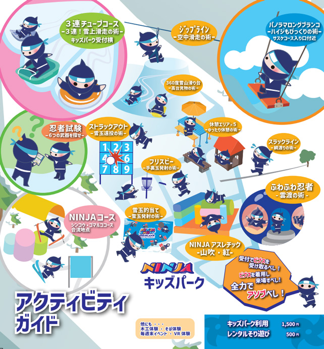 「忍者」をテーマにさまざまなアクティビティが揃う「NINJYAキッズパーク」。30種類を超えるアクティビティには、雪上を滑走する「3連チューブコース」や北アルプスが一望できる8mの「パノラマロングブランコ」、キッズ向けのゲレンデ「NINJAコース」など、親子で楽しめる多彩なアクティビティが揃っています。