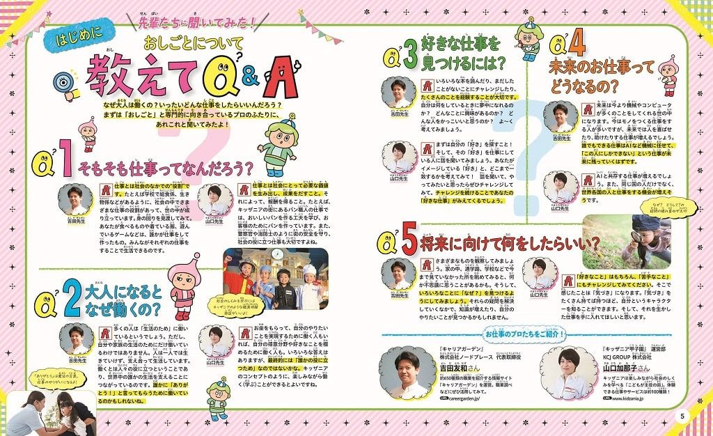 獣医士、弁護士、電車の運転士、宇宙飛行士など、実際にその職業に就いて働いている先輩へのインタビューを掲載。その職業を選んだきっかけ、日々の仕事でうれしいことや大変だったこと、なるために努力したことを教えてもらいました。また、お仕事体験施設「キッザニア甲子園」、職業情報サイト「キャリアガーデン」へのインタビューでは、“働くこと”や“未来のお仕事”について聞いています。