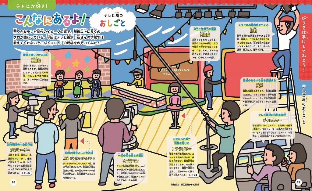 イマドキの子どもたちに人気の動画投稿者(ユーチューバー)やゲームクリエイター、eスポーツ選手から、定番人気の野球選手やアナウンサーまで、各職業の先輩に聞いたお仕事の現場を大きなイラストで図解しています。そのお仕事に関わる人たちも登場します。