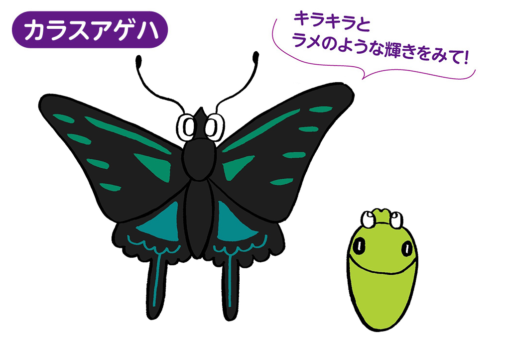 この目玉模様は「眼状紋(がんじょうもん)」といい、アゲハチョウの幼虫は、眼状紋と緑色の体でヘビに擬態しているといわれています。この擬態は、幼虫を狙う天敵である鳥から身を守るため。ただのオシャレではなく、厳しい自然界で生き抜くために必要なものなのですね!