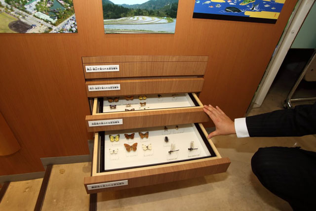 昆虫標本は、引き出し式でさまざまな生き物の標本を観察することができます。