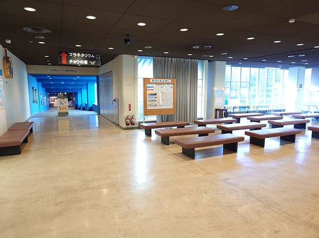 展示場内およびプラネタリウム内は飲食禁止ですが、食事場所として2022年3月現在、1階の団体ホールが開放されています。また2階の休憩ホールでも飲食は可能です。