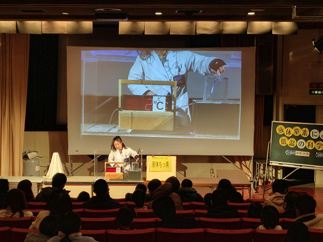 1階の映写講義室では科学センター職員による「サイエンスライブ」が開催されています。液体チッ素を使った実験や日替わりでテーマが変わる楽しい実験が目の前で体験できますよ。
