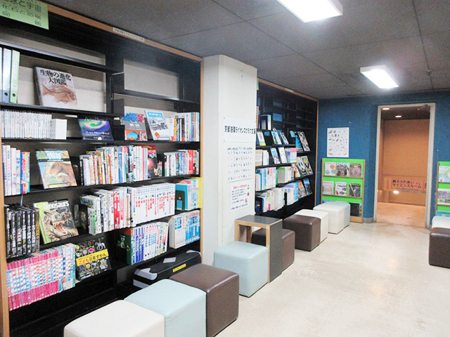 2階展示場手前には総合案内と図書コーナーがあり、自由に利用できます。地球・宇宙や昆虫に関する書籍、科学漫画、科学雑誌などが好きなだけ読めますよ。