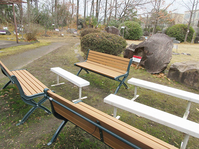 2階受付から通路をまっすぐ進み、休憩ホール右手からテラスの階段を降りると、「屋外園」があります。ここでは約40種類の岩石や化石、約300種類の樹木や植物があり、公園のようにくつろぐことができます。年間を通して蝶を観察できる「チョウの家」もあります。