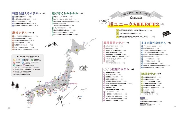「海外旅行気分が味わえる!~まるで海外なHOTEL~」「こんなところに宿が!?~知る人ぞ知る秘境HOTEL~」「ここってホントに泊まれる!? 〜異種業界HOTEL〜」など7つのテーマに沿って、ユニークな施設をたっぷり紹介。こんなホテルあるの!?という驚きの連続です。