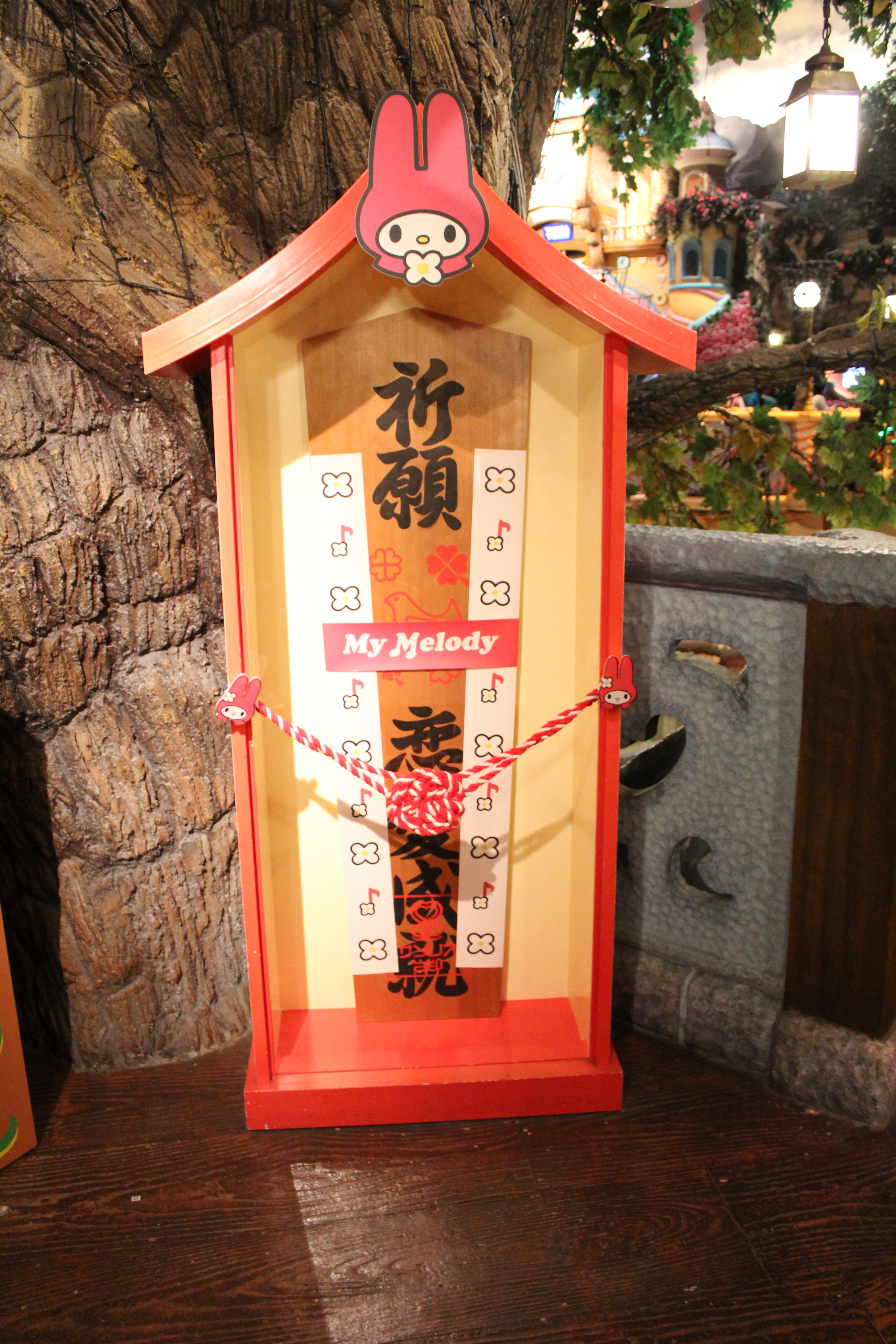 知恵の木の中に入り階段を上っていくと、まず目に飛び込んでくるのが、マイメロディの大きな恋愛成就祈願のお札!子供たちの幼稚園や小学校での小さな恋の成就や、パパやママたちの冷めない愛(!?)を願って、しっかりご祈祷しておきましょう!