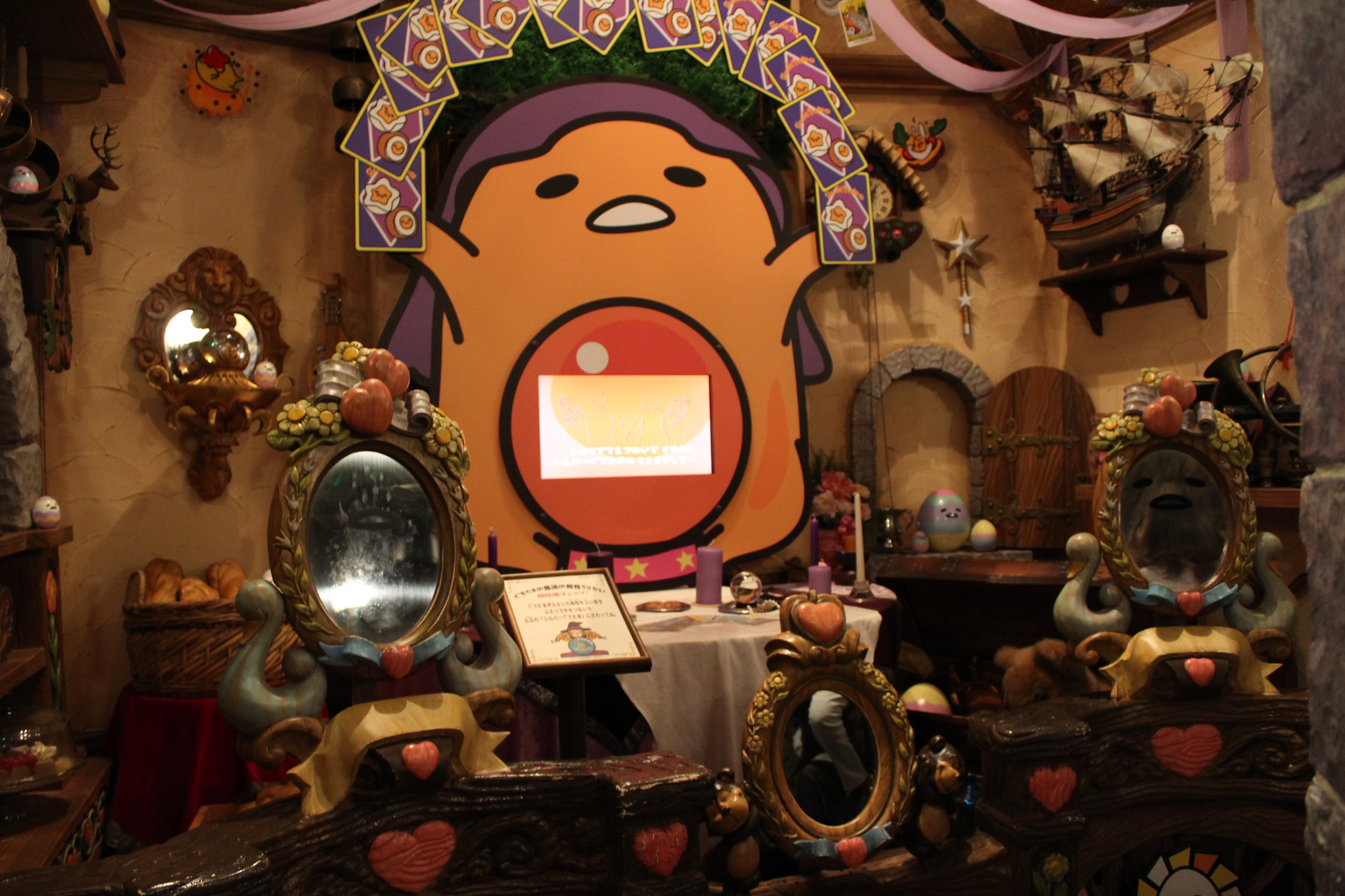 そして、家族やカップルで来たら、「ぐでたまの魔法の相性うらない」にチャレンジを。カップルで手をつなぎ、もう片方の手でパネルにタッチすると、ぐでたまが2人の相性を100点満点で診断してくれます。もちろん、恋人同士だけでなく家族でも楽しめます。娘との相性の結果がマイナスになっても、パパは落ち込まないでね!