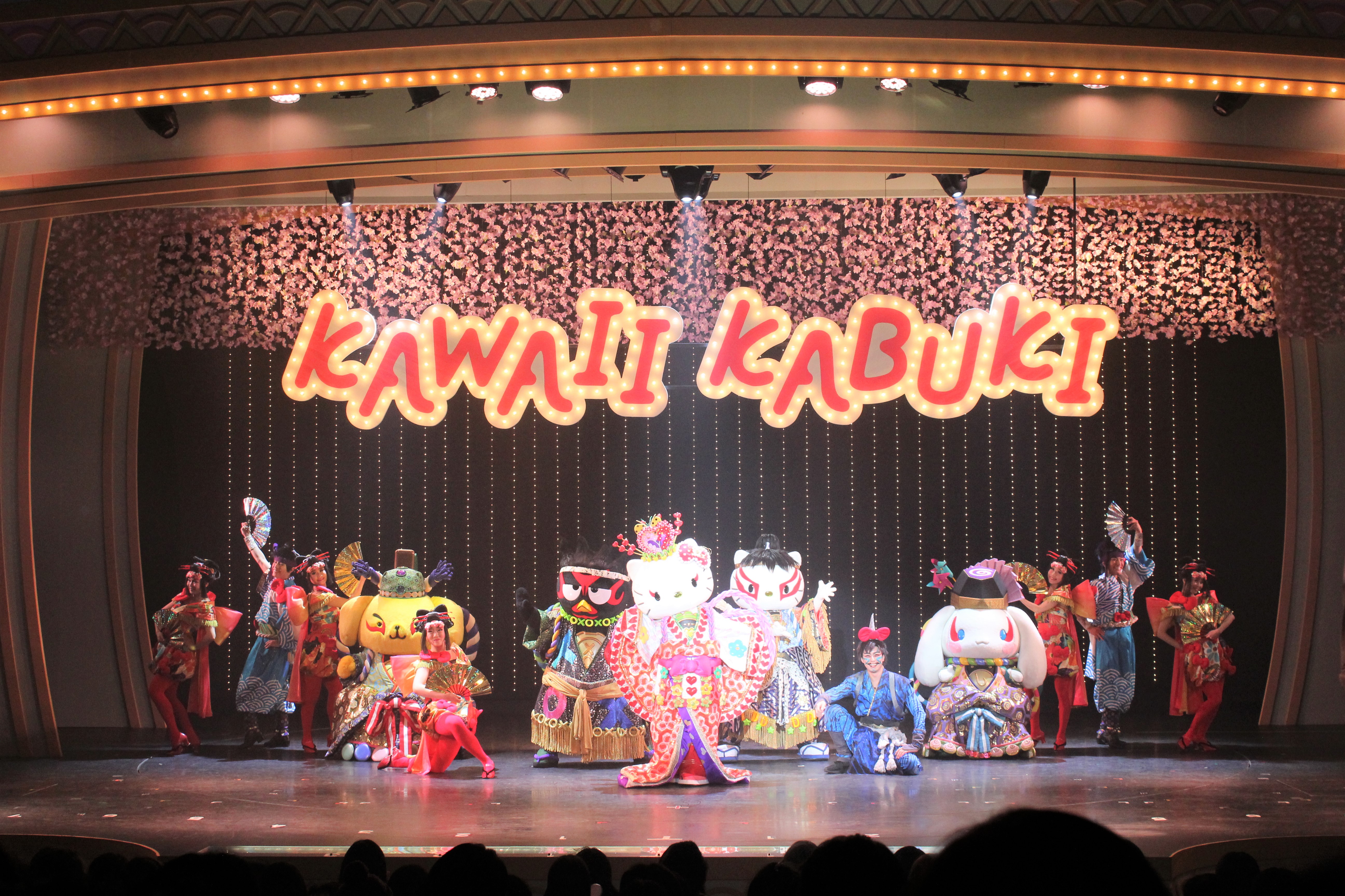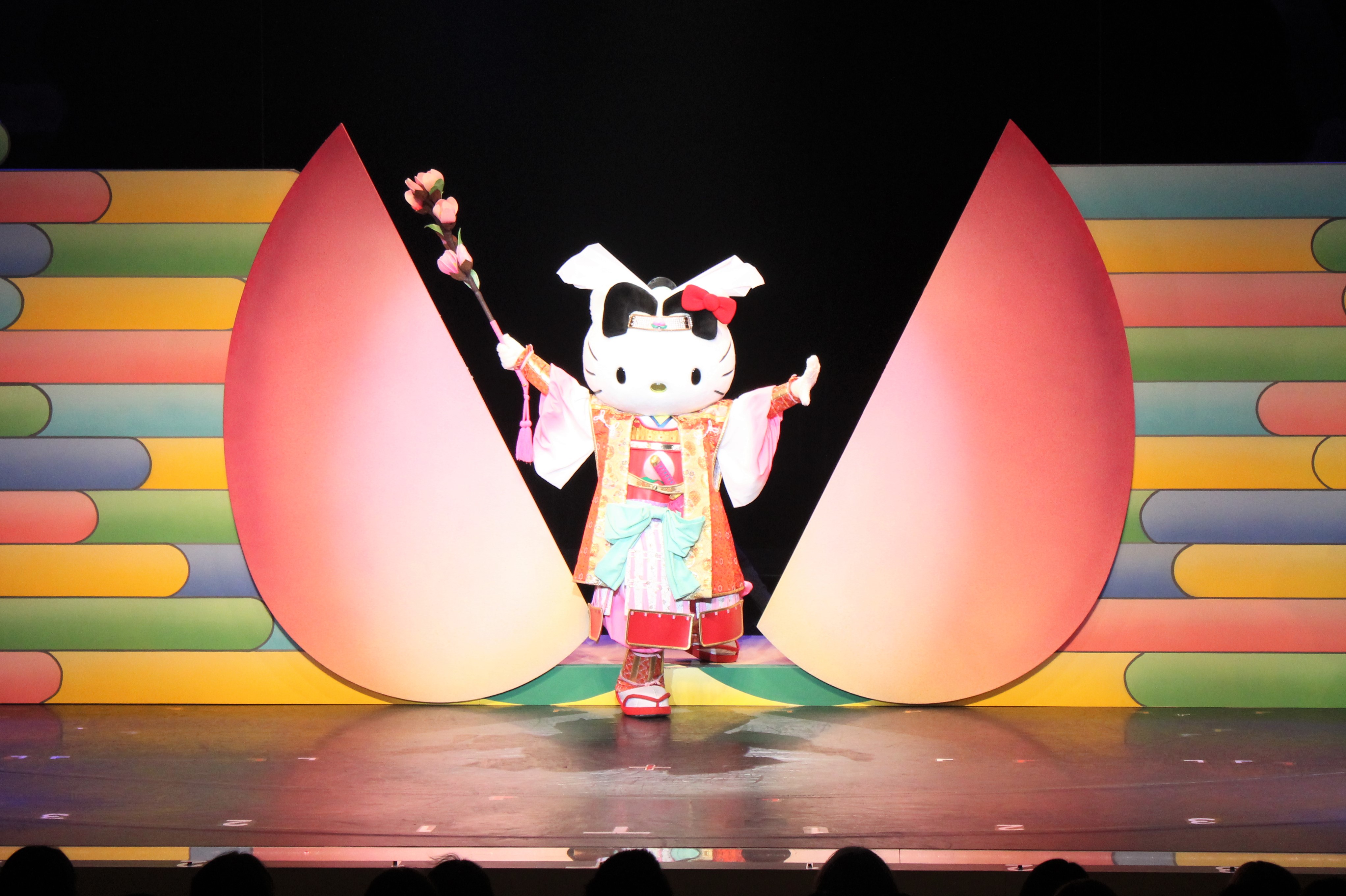 メルヘンシアターでの演目は定期的に変わりますが、2018年3月から上演されているのは、歌舞伎とサンリオキャラクターたちがコラボレーションした「KAWAII KABUKI〜ハローキティ一座の桃太郎〜」。