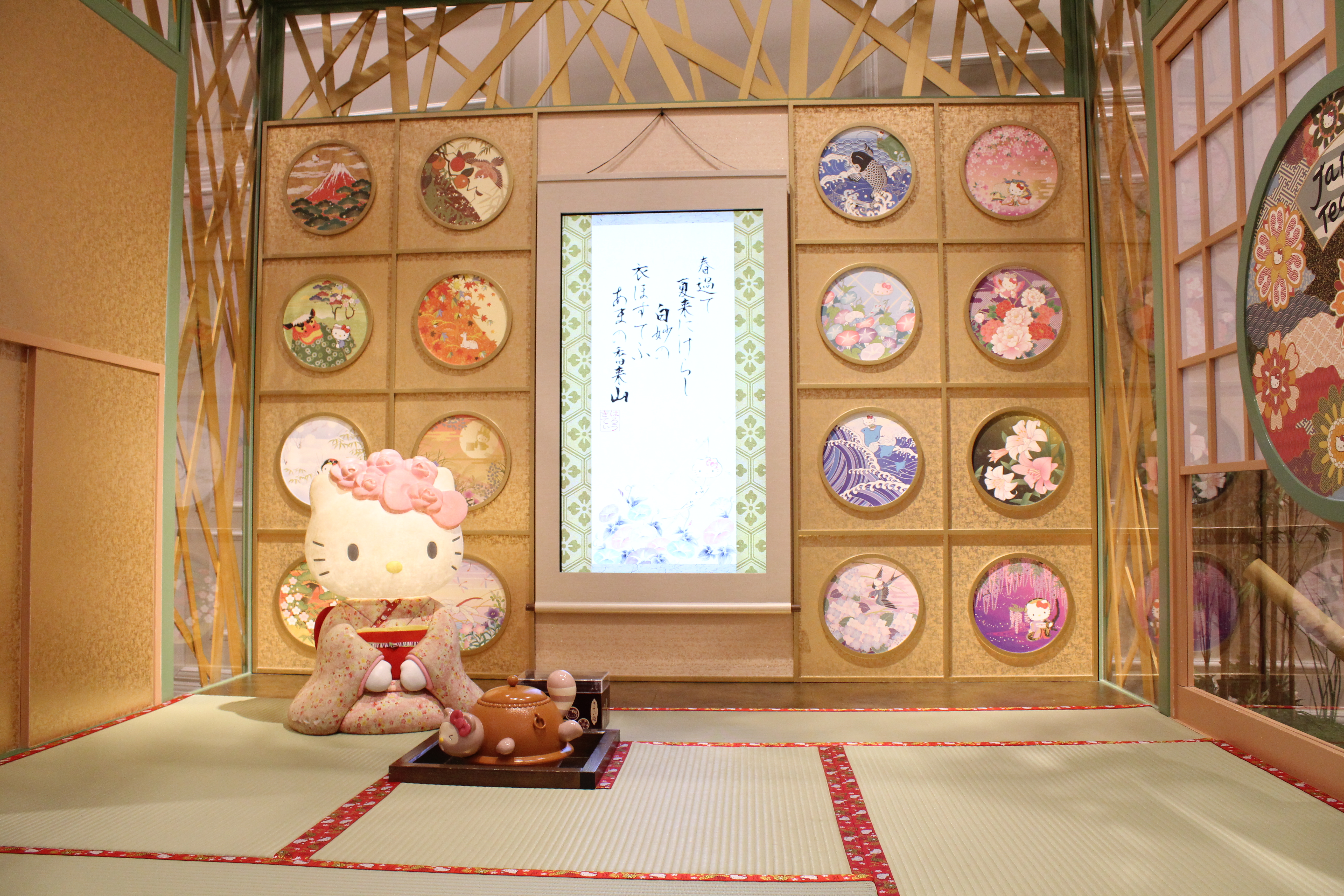 お屋敷の中には和室もあり、ハローキティが着物でお出迎え。タヌキの茶釜があったり、畳のヘリがハローキティ柄になっていたりと遊び心満点です!じっくりと観察して、こだわりのポイントを見つけてくださいね。