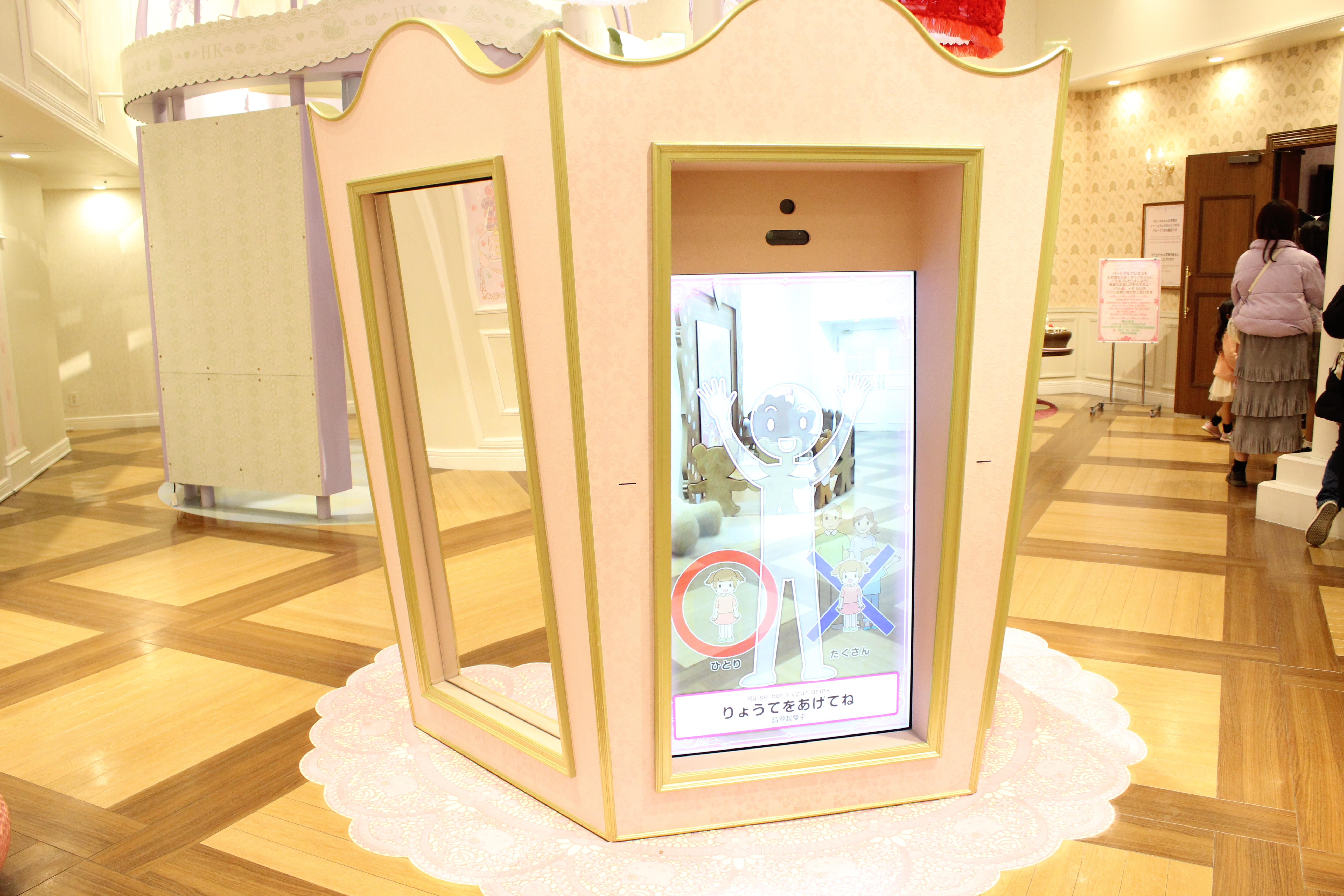 和室の先にある「ドレスタワー」には、ハローキティのドレスがシャンデリアのように飾られています。ドレスタワーに設置された鏡の前に立つと、バーチャルでハローキティとおそろいのドレスを試着できるので、ファッションショー気分が味わえますよ。