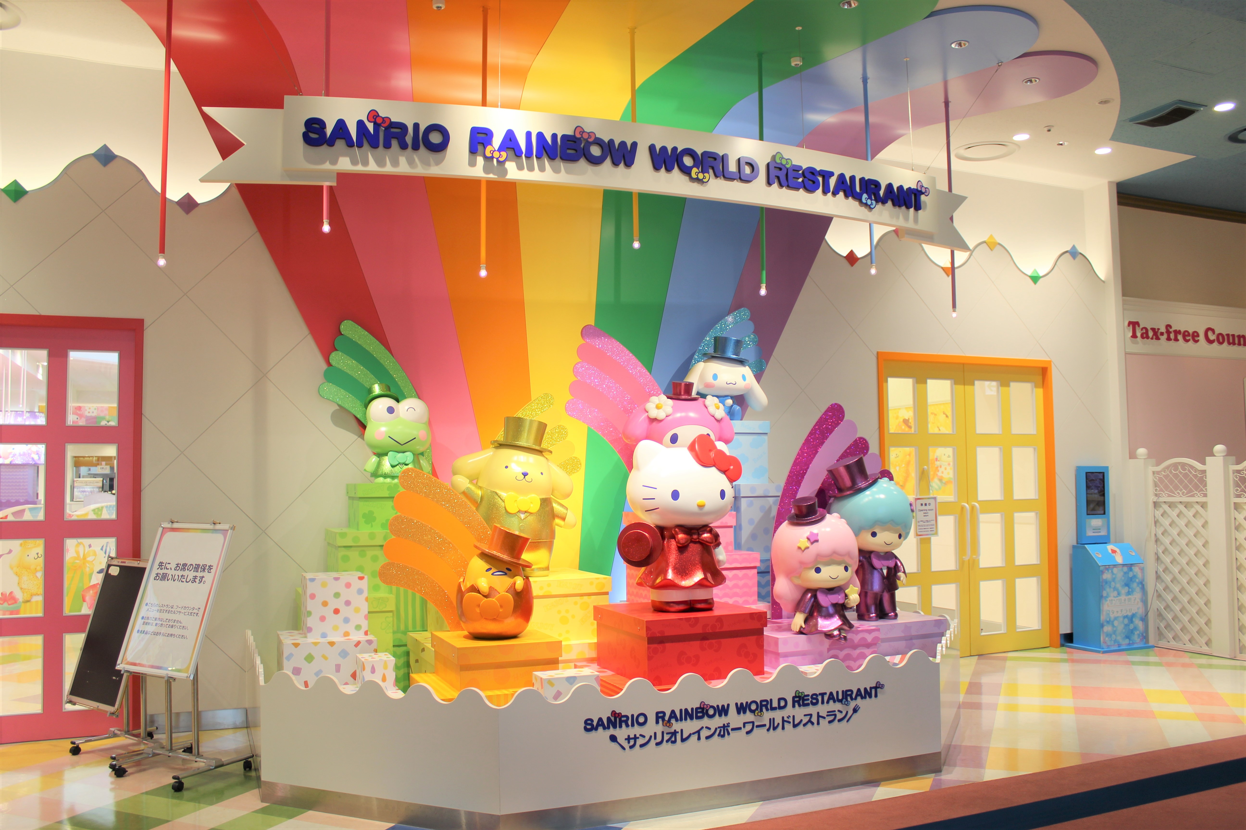 サンリオピューロランドには、楽しいお食事スポットもあります。まずは、4階にある「サンリオレインボーワールドレストラン」からご紹介しましょう。レインボーの名前の由来は、ハローキティ、マイメロディ、ポムポムプリン、シナモンロール、リトルツインスターズ、けろけろけろっぴ、ぐでたまの7つの人気のキャラクターが集合しているから。入り口では、さっそく人気者たちがそろってお出迎えしてくれます。
