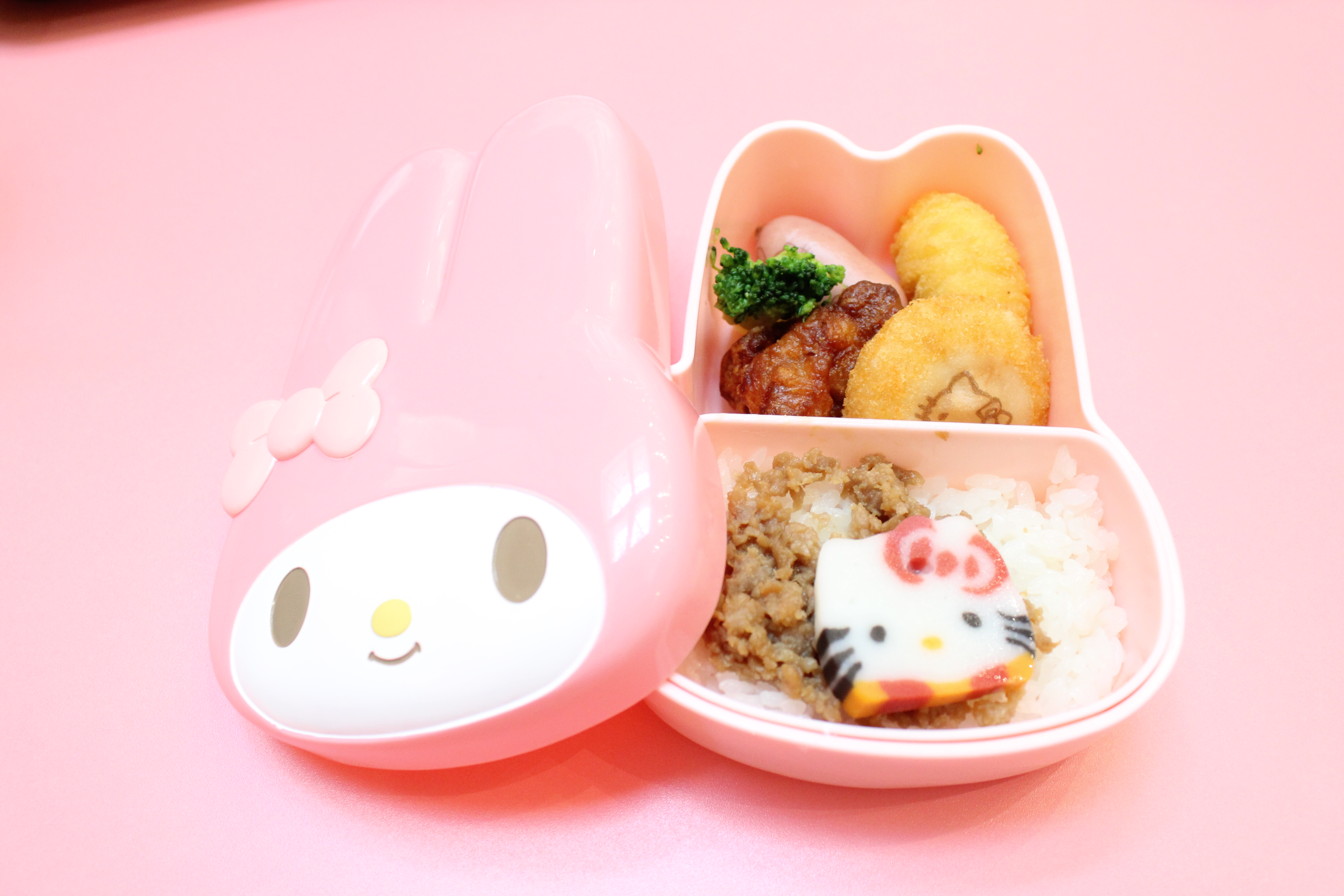 また、ランチボックスがお持ち帰りできるお弁当も人気で、ハローキティ・マイメロディ・ポムポムプリンの3種類があります。また、大人たちにも人気なのが「定番!キティ醤油ラーメン」。ピューロランドオリジナルキティの焼き印がついた焼きかまぼこもいっしょについてきます。ランチボックスの持ち帰り用に袋もつけてくれる心配りもうれしいですね!