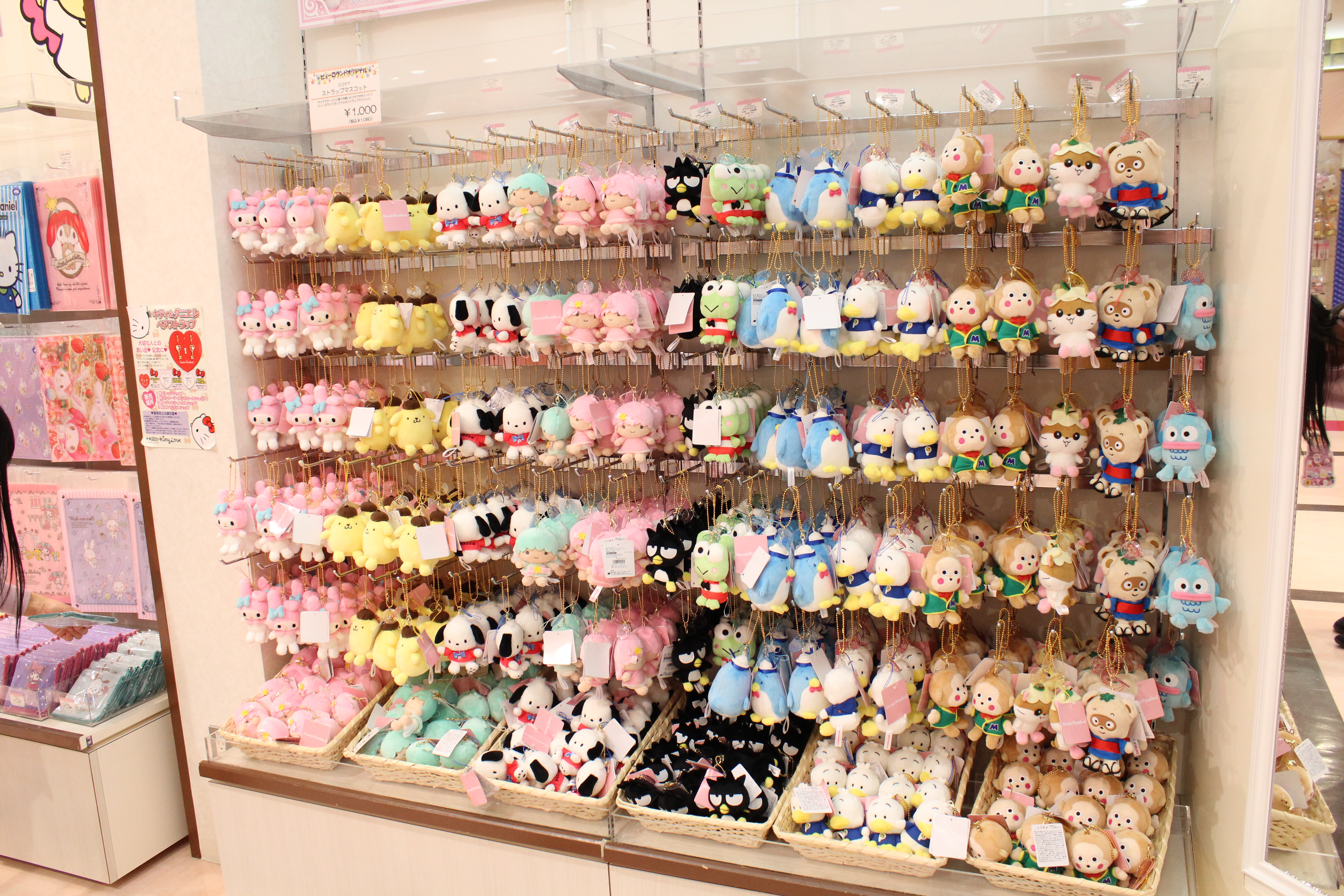 キーホルダーコーナーでは、サンリオキャラクターが勢揃い!毎年、実施している人気投票で上位のキャラクターは、キーホルダーコーナーでも売れ筋になるそうですよ。