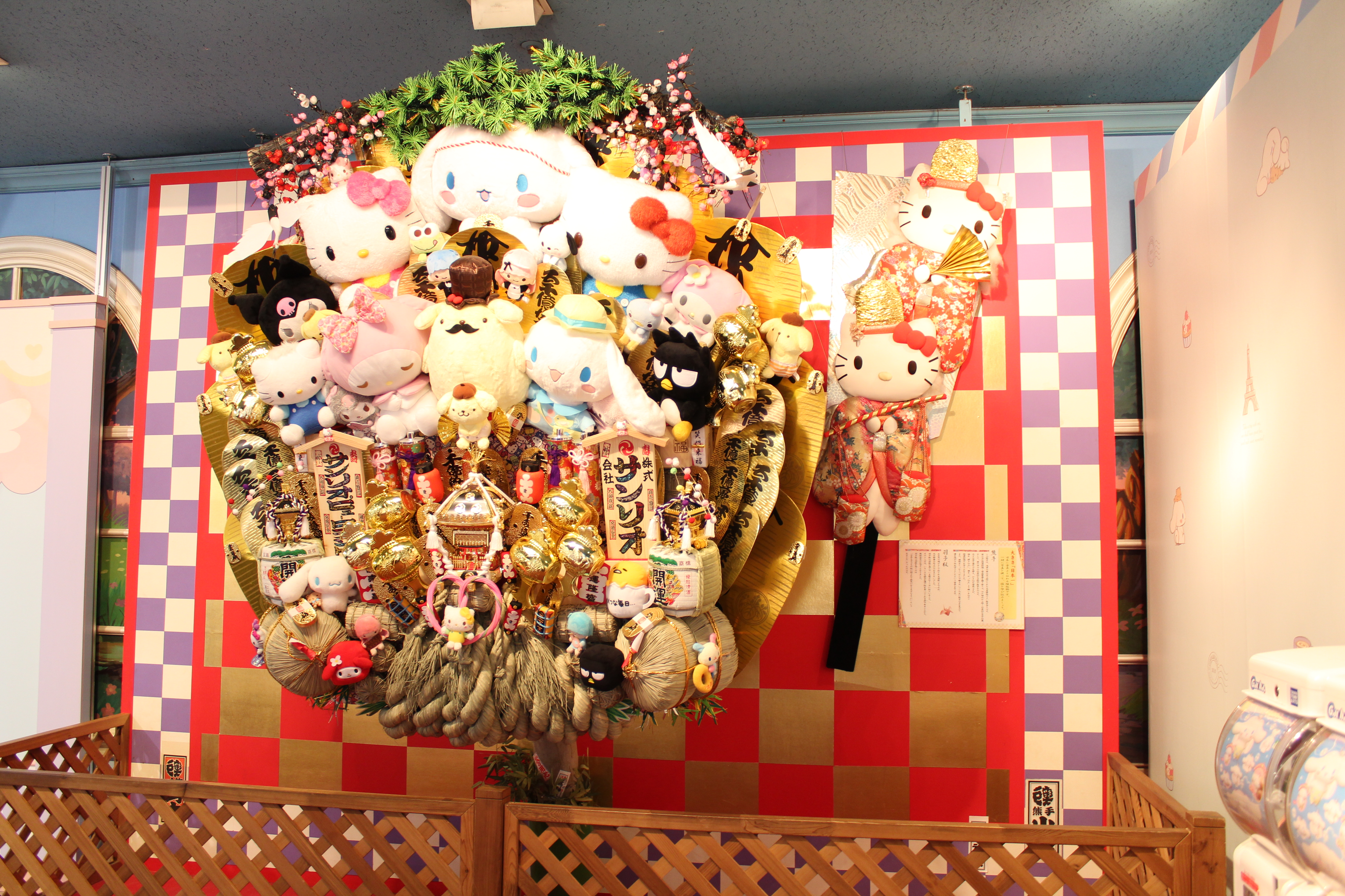 サンリオキャラクターが勢ぞろいしている熊手は、4階に上がるとまず目に飛び込んできます。日本で一番の大きさの熊手なのだとか。