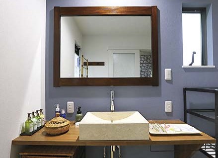 バスルームでは富士のバナジウム水を使用しています。空テラスには、このほか露天風呂も。