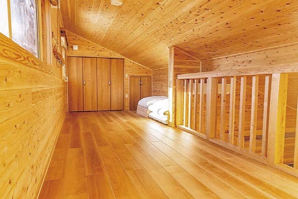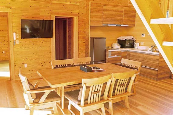 6300㎡の敷地には15棟の和風ログハウスが点在し、うち3棟はペットも一緒に宿泊できます。上質な国産杉をふんだんに使ったログハウスは、フロアや階段、壁、室内家具まですべて木製。どこにいてもやさしい木の香りがして心身が癒やされます。