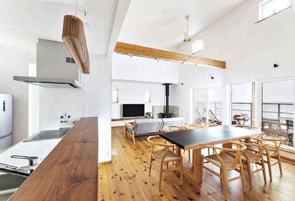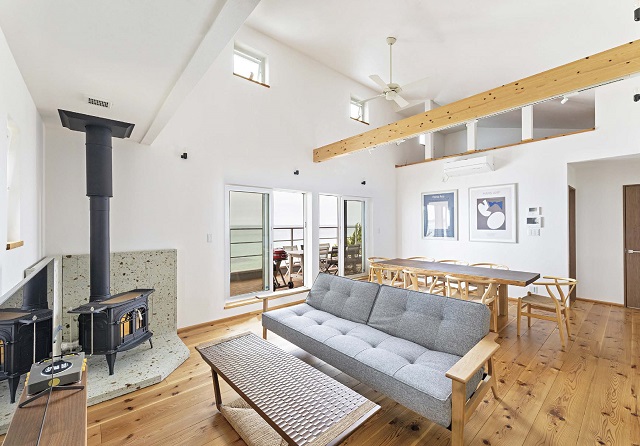 足ざわりのよい自然木のフロア、白い壁。ダイニングと一体になった2階のリビングはスタイリッシュな空間です。海を見渡すこともでき、自由で心地よい時間が流れています。