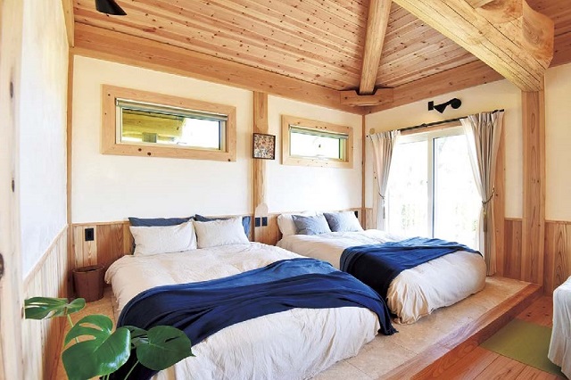 世界自然遺産に登録されたやんばるの森に立つ「ゆくるん家(ゆくるんや)」。ログハウス職人のオーナーが手がけたこの貸別荘は、本土から運んだ杉や檜と、琉球石灰岩や新琉球漆喰を組み合わせた唯一無二のログハウスです。家具もほとんど手作りで、木の香りとぬくもりに包まれながら、鳥のさえずりや澄みきった空気、満天の星など、やんばるの大自然を体感できます。また、BBQ 食材、しゃぶしゃぶ、もつ鍋のケータリングサービスのほか、充実したアメニティや設備も揃います。小さな子ども連れにもおすすめの宿です。