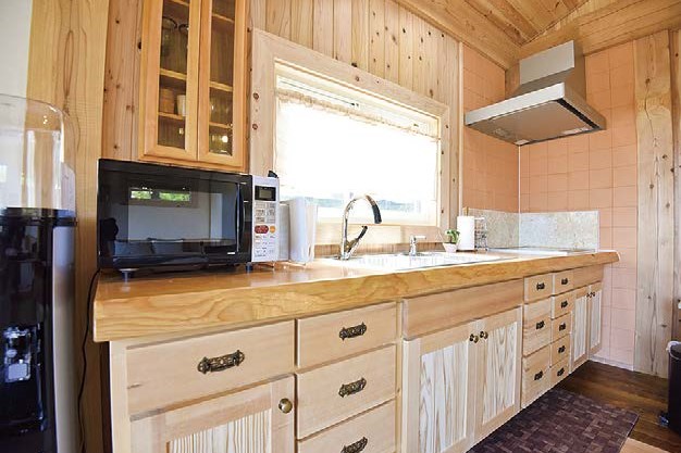 3mの一枚板で造られたキッチンには調理器具一式を完備しています。
