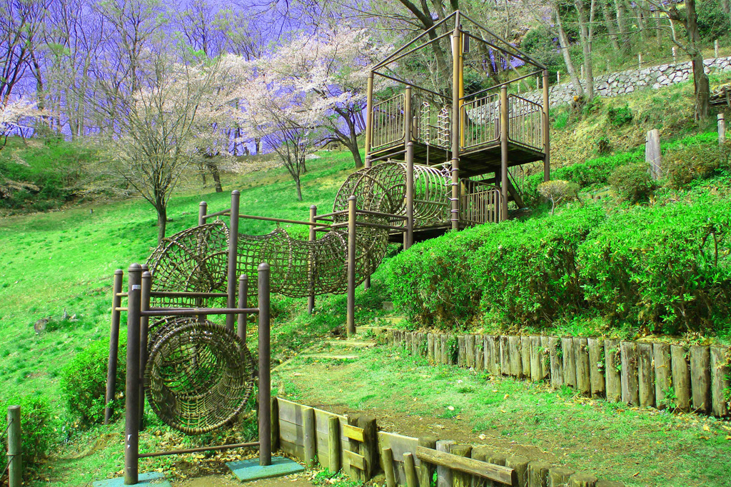 山の上にアスレチック遊具があり、六角トリデという木製遊具や、ターザンロープ、平均台などで遊ぶことができる。春にはたくさんの桜も楽しめるお花見スポット。