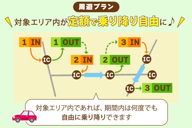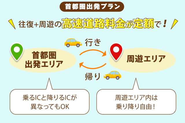 「周遊プラン」は対象エリア内のICを期間内何度も乗り降りできるという、いわゆる“乗り放題”プラン。通常なら乗り降りするたびに料金がかかりますが、「周遊プラン」は定額なので、乗り降りすればするほどお得になります。さらに、「周遊プラン」に加えて首都圏出発エリアから周遊エリアまでの1往復も定額利用できる「首都圏出発プラン」なら、さらにお得に!