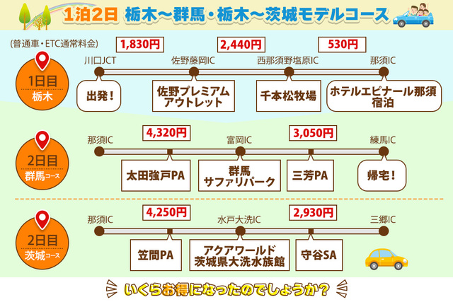 2つの目的地別のコース、いかがでしたか? もちろん、エリア内なら乗り降り可能なので、アレンジも自由自在です。今回ご紹介したのは2日間の周遊プランでしたが、さらにお得な3日間のプランもあり。車での旅の楽しみが広がる、高速代も節約できる。いいことづくめの「ドラ割」、使わない手はなさそうです!