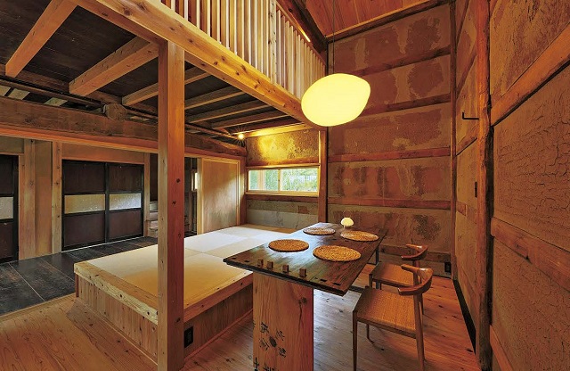 古い納屋を改装した「十五夜-MITSUKINO-」のリビング。古びた土壁がそのまま残ります。