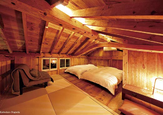 豪雪地域である西会津町奥川郷の楢山集落にある、築120年以上の蔵や納屋を改装した宿泊棟。コンセプトは「集落に暮らすように泊まれる宿」で、納屋は建物内で2棟に分かれています。