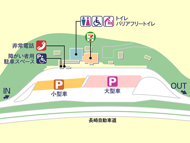 長崎自動車道・上り線にある最初のPAで、日岳(ひだけ)トンネル手前に位置している。ここは上り線のみに設置されているPAで、下り線のPA(木場PA)はトンネルを挟んで反対側に位置している。トイレ・自動販売機のほか24時間営業のコンビニ「セブン-イレブン」が設置されており、意外に便利に利用できる休憩所だ。コンビニでは通常の日用品のほかに、「長崎物語」「ざぼんどら焼き」など長崎のおみやげ品もそろっている。小規模なPAだが、エリアの周囲には自然もたっぷりあってくつろげる場所だ。付近の立ち寄りスポットとしては、大村市郊外の自然公園「琴平スカイパーク」がおすすめ。