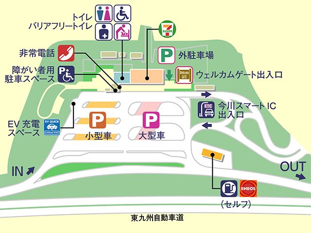 福岡県行橋市にある東九州自動車道の今川PA【上り】を紹介。スマートインターチェンジ・一般道からの出入口・ガソリンスタンドなどのお役立ち施設・サービスの有無もチェックしましょう。