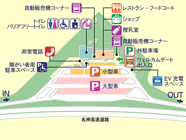 | 一般道からの出入口 | あり/ウェルカムゲート:24時間利用可(店舗営業時間は7~21時) |
